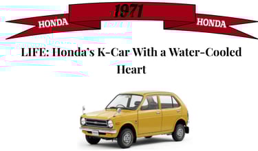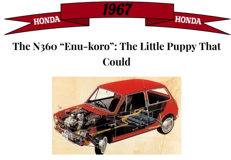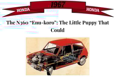 Nicknamed “Enu-koro” (Little Puppy N), the N360 was cute, affordable, and surprisingly roomy. It seated four adults, had a 31 hp air-cooled engine, and was marked as a comfortable, affordable, and spirited "People's Car; for the Japanese market. Honda’s “Man Maximum, Machine Minimum” philosophy was born here, making the car small, and the cabin big, which made everyone else jealous.