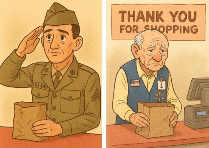 At 87, Ed found himself back in the workforce. From Ace Hardware to Meijer, and eventually Walmart, he worked 40-hour weeks as a cashier—an Army veteran and lifelong laborer forced to keep punching the clock just to survive.