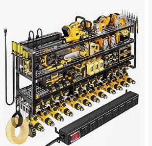 This wall‑mounted rack keeps drills, batteries, chargers, and accessories organized and ready to grab. No more digging through drawers or losing chargers.