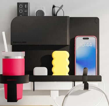 Perfect for small bedrooms, dorms, RVs, or anywhere you need a little extra surface space. It sticks on with adhesive and holds phones, remotes, glasses, and more.